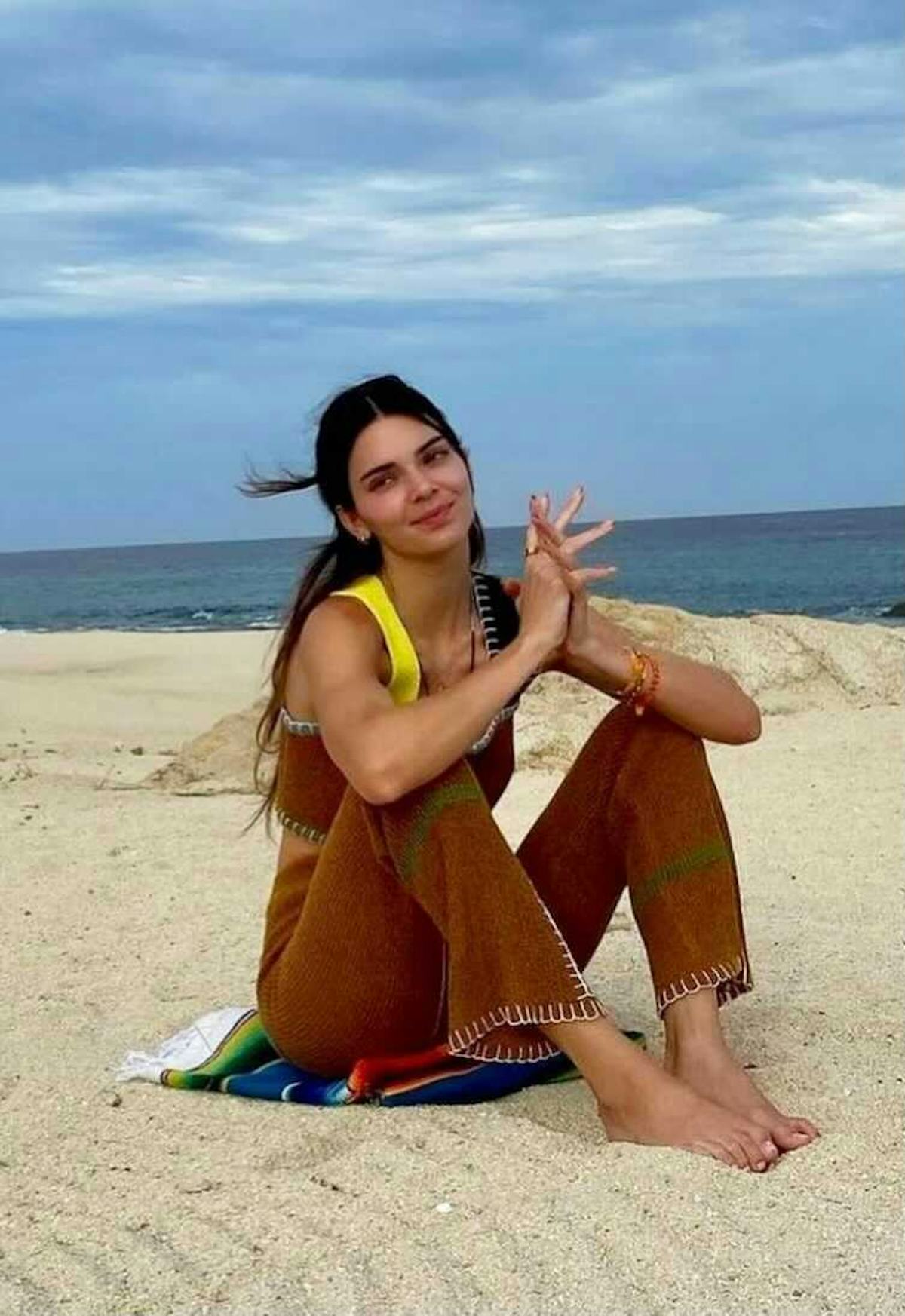 For her next fit, Jenner dipped her toe into the world of summer knits, wearing an ochre two-piece set from Hong Kong-based label YanYan Knits while on the beach.