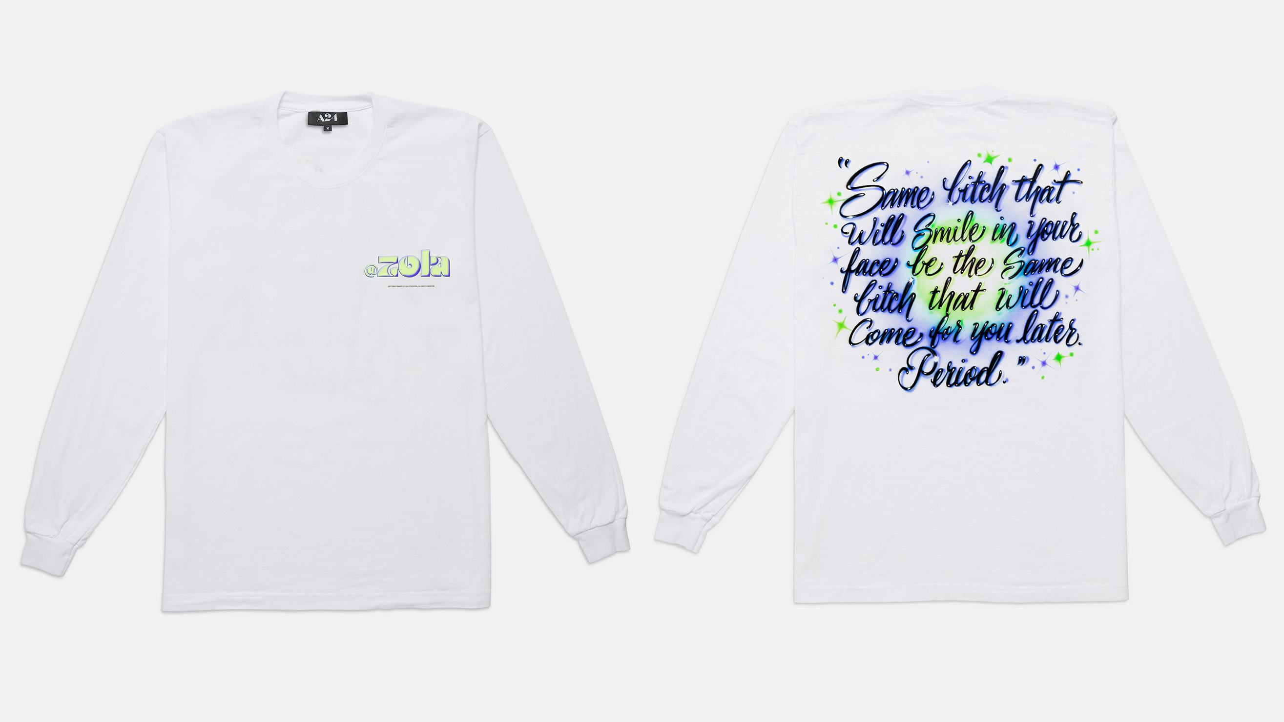 The second release, a long-sleeve T-shirt with a subtle A24 logo on the front, features an airbrushed quote from Zola on the back saying, “Same b*tch that will smile in your face be the same b*tch that will come for your later. Period.”