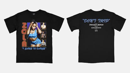 “My inspiration was for the graphics was Blackness,” Rahim tells NYLON. “The rap tee felt like an appropriate way to portray the energy of Zola,” explains Rahim. “I wanted her character to be viewed more like a superstar.” On the short-sleeve tee, actress Taylour Paige as Zola is front and center alongside the rest of the film’s cast.