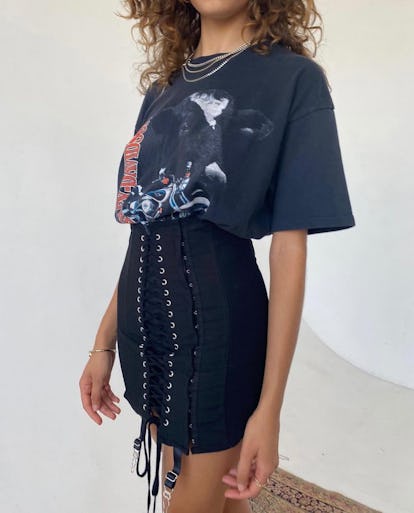 You can also dress down the corset skirt by opting for an oversized top, like a vintage graphic tee, and pair it with sneakers or boots.