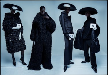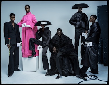 Hair by Gabrielle Sadé; makeup by Hannah Murray at Art + Commerce. Models: Seth Bedzo at 16 Paris; Elhadji Mar at M Management; Sunmoon at Tigers by Matt; Jibriil Ollow at IMG Paris; Mohamadou Diakhité at Success Models; Mamuor Awak, Quaye Dennis, and Emmanuel Adjaye at Elite Paris. Casting by Madeleine Østlie at AAMØ Casting at CLM. Set design by Anna Sbiera-Paléologue at Swan Management.