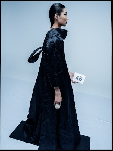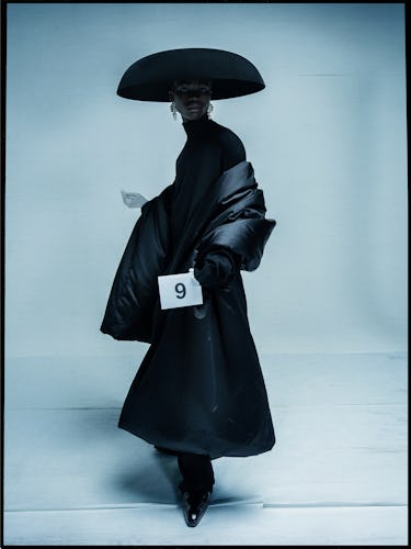 The show itself lasted slightly more than 13 minutes, during which the only sound was the rustle of gowns as the models walked by. Gvasalia told reporters backstage that the hushed atmosphere was a tribute to the heritage of Balenciaga, but was also “a moment of silence to just shut up for a minute” and take a reprieve from all of the noise of the fashion industry—the sneaker drops, the collaborations, the glamorous circus that Gvasalia disrupts but also conducts. “I’m also very critical about what I do,” he says. “During the process of making couture, I realized all the things I didn’t like doing in ready-to-wear. The most important thing is the essence of dressmaking in itself, but I might lose interest if I just keep on doing it in my comfort zone, just filling out collection plans in order to meet deadlines and get to financial targets. That’s not what I’m here for, and I don’t think this industry can evolve or even survive if it were only based on that. So the moment of silence was about that.”