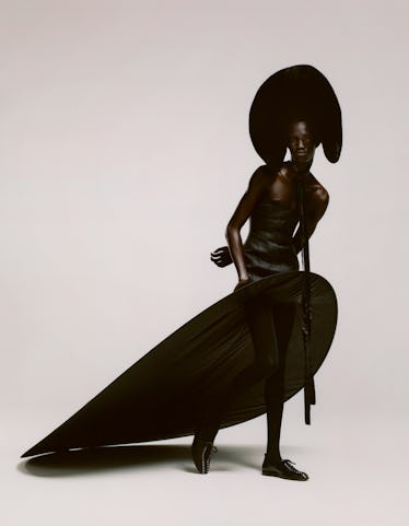 That doesn’t mean they aren’t reacting to the realities of our new world in other ways. Sharpe’s tent dresses and Reed’s flying saucer hats, for instance, are just the thing for enforcing social distancing—put one on, and it’s literally impossible to get within coughing distance of another human. The same applies to Marco Ribeiro’s “circles”—giant pleated rings of stiffened, brightly colored fabric that the Brazilian-born, Paris-based designer uses to various effect. Some are face-obscuring hats; others serve as exaggerated collars. “You see the circle but not who is behind it, so it is kind of a protection,” says Ribeiro, who says he felt the need for a sartorial shield even more as a Black man in an industry where he didn’t see himself represented. The wearable sculptures are also, he points out, visually arresting in the literal sense of the word. “They have the effect of a stop sign. You see the circle, and you have to stop to ask, ‘What is that?’ ”