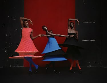 From left: Ikechukwu wears a Terrence Zhou dress; Christian Louboutin shoes; stylist’s own tights. Manase wears Bad Binch Tong Tong by Terrence Zhou pleated skirts; Saint Laurent by Anthony Vaccarello shoes; stylist’s own tights. Ndiaye wears a Bad Binch Tong Tong by Terrence Zhou hoop dress and pleated skirt; Tom Ford shoes; stylist’s own tights.