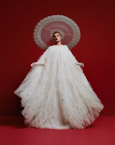 Though perhaps prone to a bit of exaggeration, Reed is not kidding about the market. Despite the continued dearth of occasions for which to dress up, his deliciously melodramatic designs, he says, are flying off the mannequins. “The dress from my last collection that was this huge gown, modeled on a male-identifying model, with this huge hat, sold the first day it went in the window at Selfridges for over $12,000. And everyone was like, No one is going to buy that! We’re in a pandemic! Where are they wearing that? But we’ve had nothing but loads of people wanting a re-creation.”