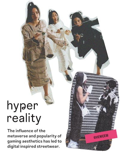 Though we’re seeing a slew of throwback trends popping up on our feeds as of late, the era of futuristic fashion is finally upon us. “Hyper Reality” is an aesthetic that is all about channeling your dream avatar, and inspired by Japanese street style, video games, techno raves, and military-inspired silhouettes. The influence of the metaverse is also evident with this trend, and you can often see it come to life through monochromatic layered looks, for instance.
