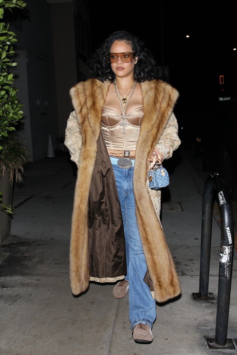 Miss Fenty stepped out at her home away from home, Giorgio Baldi in Santa Monica, wearing a decadent fur coat — despite Los Angeles only dipping into the low 40s. She paired her boss-bitch outerwear with the must-have sneaker of the moment, the Puma Speedcat, and some basic blue jeans and a silk tan corset, keeping it sexy and cute.