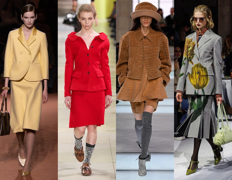 Skirt sets are nothing new in fashion. But for fall 2025, we saw this wardrobe staple in more vibrant colors, distinct shapes, and uncanny fabrics. There was a made-to-order croc suede set at Louis Vuitton that consisted of a jacket, miniskirt, and matching boxer shorts. Some more classic examples: the lemon-yellow skirt suit at Fendi, the tailored red skirt suit at Miu Miu that’s slightly off, and the embellished set at Gucci.