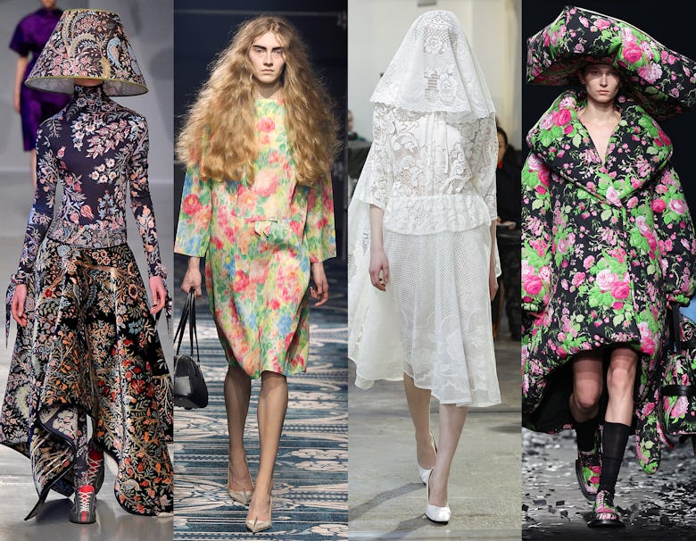 This is a nod to our favorite bargain home supply store, Floor & Decor—this season, we saw clothing inspired by home furnishings. Look 20 from the Prada show sparked a memory of my grandmother’s floral-print couch. Look 23 at Saint Laurent also brought back fond memories of the plastic covering that would adorn said couch. Marie Adam-Leenaerdt showcased a full lace ensemble reminiscent of a dining room tablecloth, while Zomer had models doubling as lamps by sporting actual lampshades as hats. Versace went full duvet with its cheeky take on a ballgown.