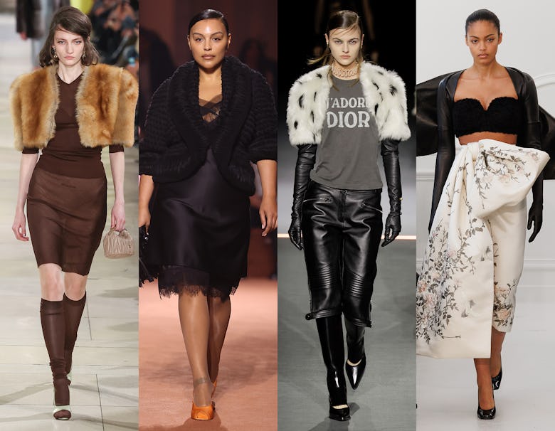 We’re talking about the bolero here, a jacket or sweater that’s typically waist-length, open in the front, and has long sleeves. She’s light, she’s easygoing, you can dress her up, you can dress her down—she’s what we like to call Miss Versatility. At Dior, we saw a fabulous short-sleeve fur version paired with a casual T-shirt; a nice contrast to Miu Miu’s fur worn alongside a simple knit set. Fendi presented a luxe knit on recent Skin Talk guest Paloma Elsesser, and Valentino nailed the bohemian look with a cute shrug that had brown fur trim.