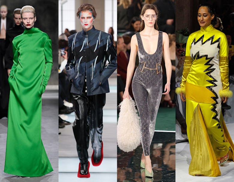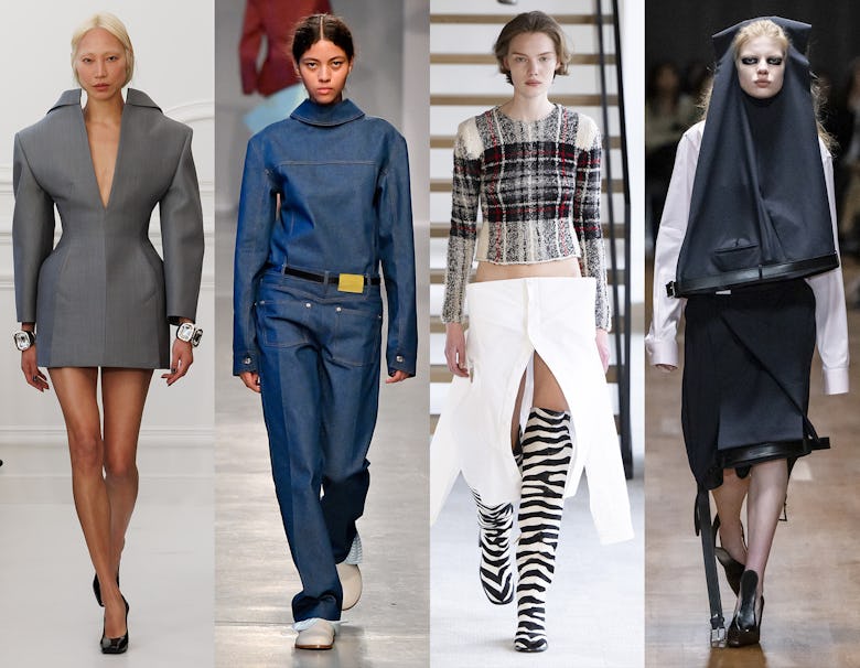 From left to right: looks from the Fall/Winter 2025 runways of Calvin Klein, Schiaparelli, Duran Lantink, and Willy Chavarria