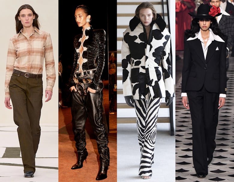 We saw lots of American West motifs on the fall 2025 runways—looks that blended life on the ranch with Southwestern style, plus a dose of 1980s Dallas opulence. This simple but eye-catching plaid button-down worn with brown jeans at Veronica Leoni’s first collection for Calvin Klein was a standout, plus the elevated ranchero styles at Willy Chavarria. Who could deny the cheeky cow print at Duran Lantink? And Daniel Roseberry, who’s originally from Texas, turned the cowgirl glam for his Schiaparelli collection, putting her in leather chaps and layered western belts.